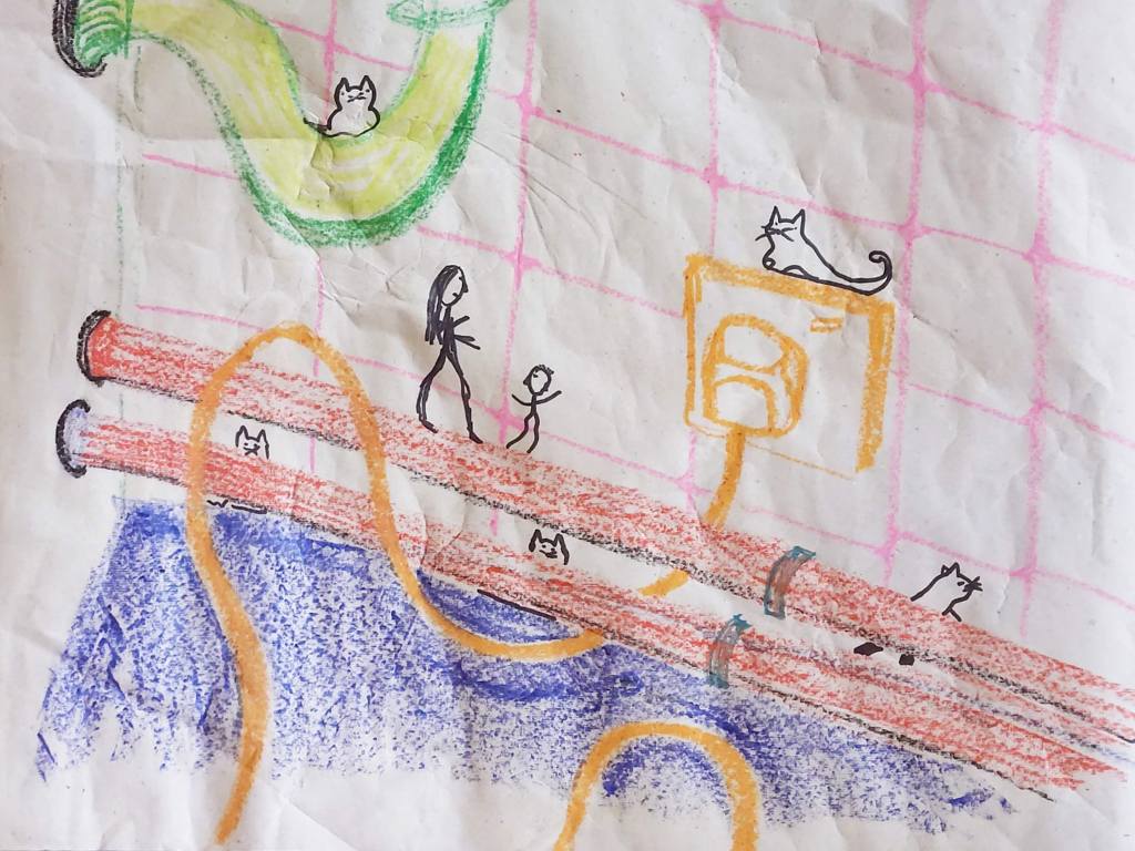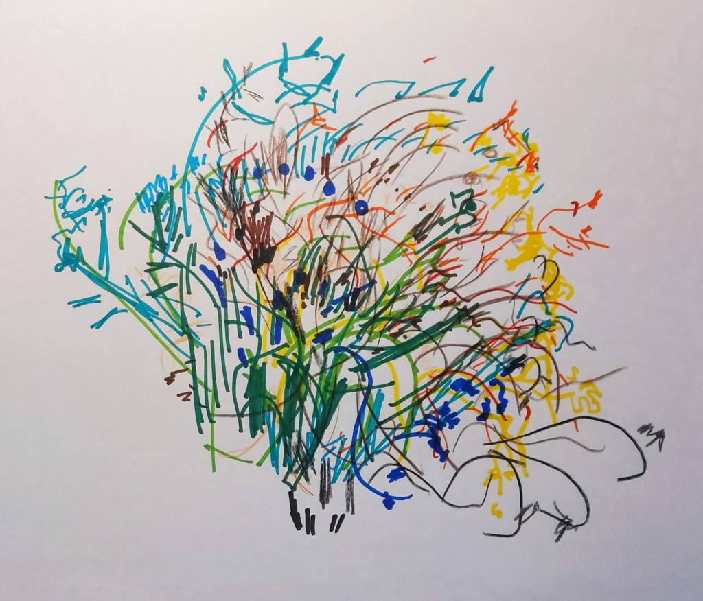 I made this during my 2023 episode. I drew the composition en plein air at a local community garden. I then coloured the piece in using pencil and glitter pens.